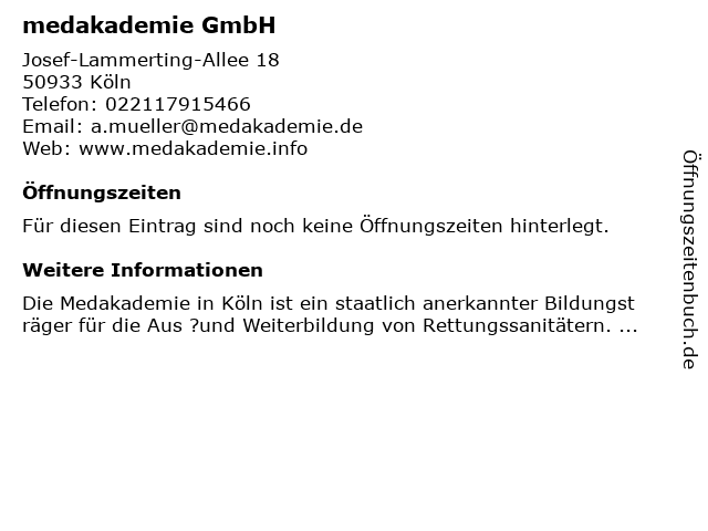 | Öffnungszeiten medakademie GmbH in Köln anzeigen | |