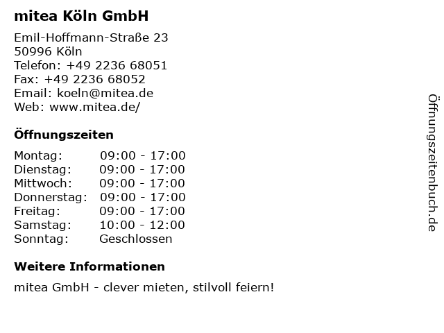 | Öffnungszeiten mitea Köln GmbH in Köln anzeigen | |
