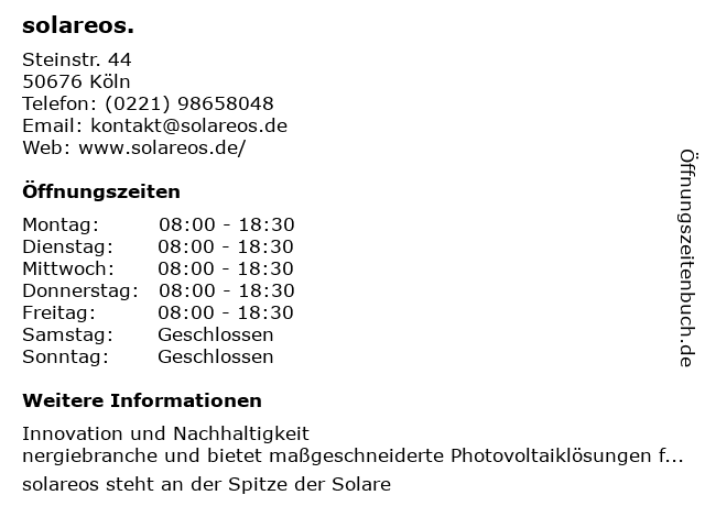 | Öffnungszeiten solareos. in Köln anzeigen | |