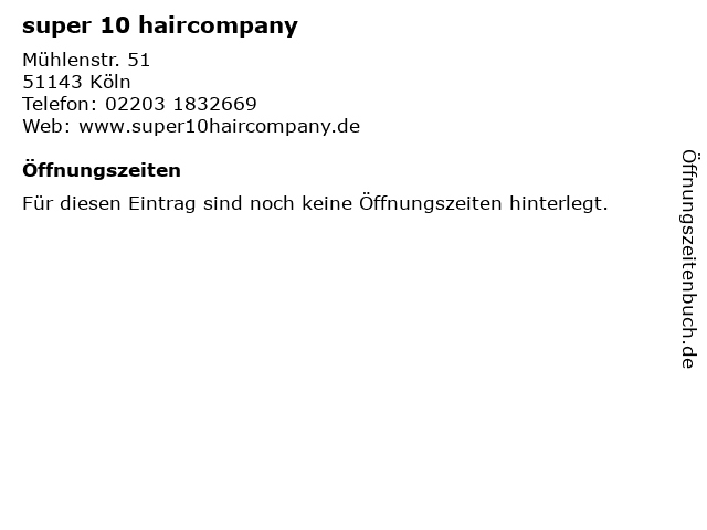 | Öffnungszeiten super 10 haircompany in Köln anzeigen | |
