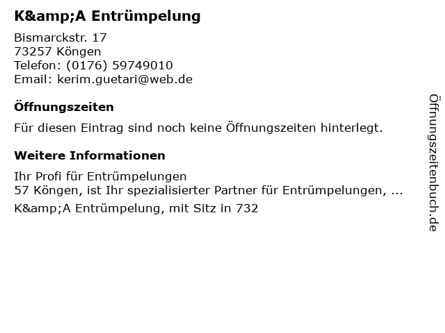 | Öffnungszeiten K&A Entrümpelung in Köngen anzeigen | |