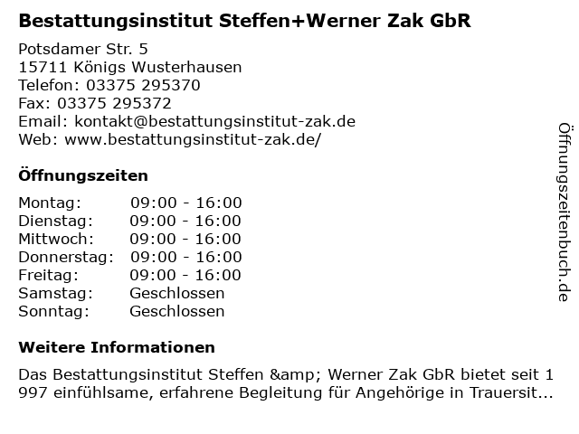 1 Steffen & Werner Zak GbR Bestattungsinstitut (Entfernung: 0,00 km) Potsdamer straße 5, 15711 Königs Wusterhausen 5 6 |
