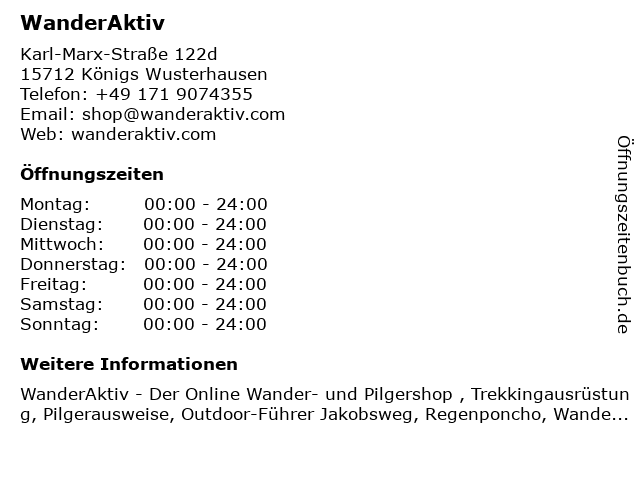 | Öffnungszeiten WanderAktiv in Königs Wusterhausen anzeigen | |