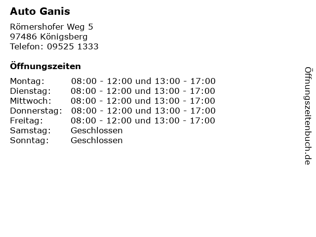 | Öffnungszeiten Auto Ganis in Königsberg anzeigen | |
