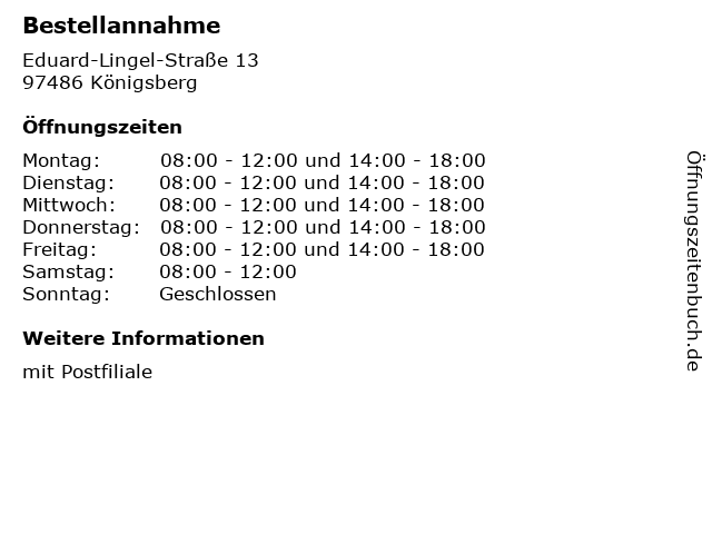 | Öffnungszeiten Bestellannahme in Königsberg anzeigen | |