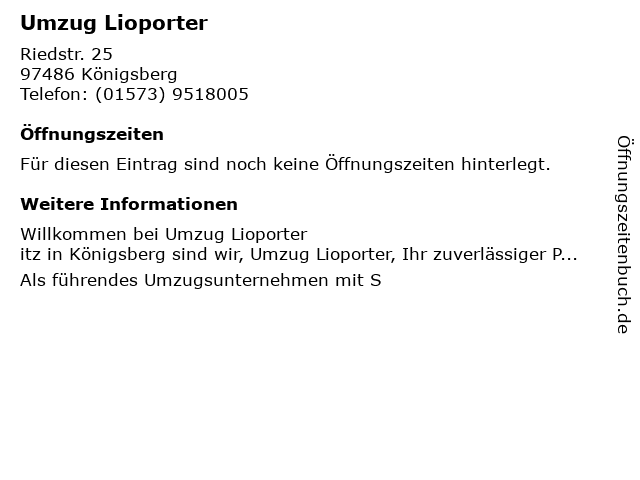 | Öffnungszeiten Umzug Lioporter in Königsberg anzeigen | |