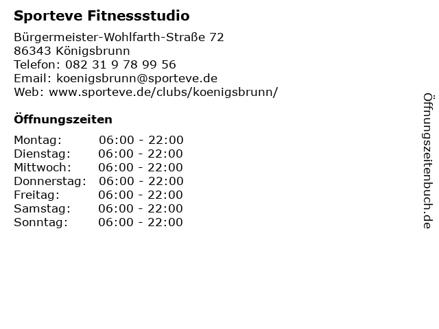 | Öffnungszeiten Sporteve Fitnessstudio in Königsbrunn anzeigen | |