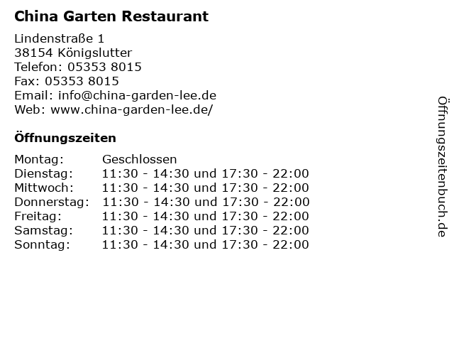 China Garten Restaurant in Königslutter: Telefonnummer, Öffnungszeiten und Adresse