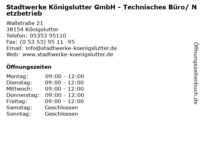 Branchen & Suchbegriffe zu Stadtwerke Königslutter GmbH - Technisches Büro/ Netzbetrieb:büro/, energie, netzbetrieb, stadtwerke, strom, technisches, versorgung |