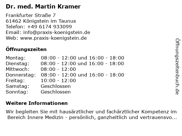 3 Martina Voß und Beate Kramer - Praxis für Allgemeinmedizin (Entfernung: 9,81 km) Saalfelder Straße 13, 65931 Frankfurt am Main 6 Objektiv. Gesellschaft für juristische Fotografie mbH Karsten Kramer (Entfernung: 16,67 km) Brahmsstr. 4, 60318 Frankfurt |