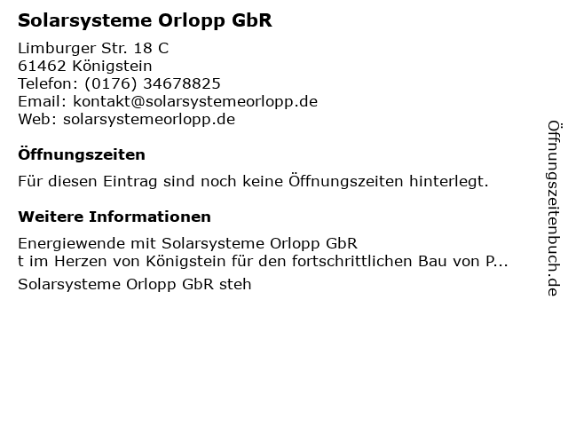 | Adresse Solarsysteme Orlopp GbR in Königstein anzeigen |