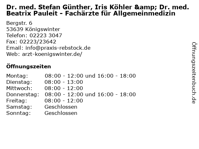 Dr. med. Stefan Günther, Iris Köhler & Dr. med. Beatrix Pauleit - Fachärzte für Allgemeinmedizin in Königswinter: Telefonnummer, Öffnungszeiten und Adresse Aktualisiert am: 15.02.2026