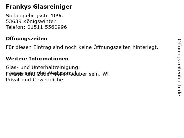 | Öffnungszeiten Frankys Glasreiniger in Königswinter anzeigen | |