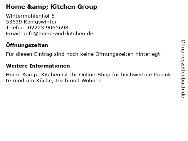 | Öffnungszeiten Home & Kitchen Group in Königswinter anzeigen | |