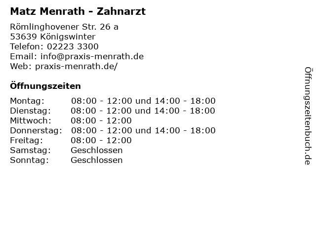 | Öffnungszeiten Matz Menrath - Zahnarzt in Königswinter anzeigen | |