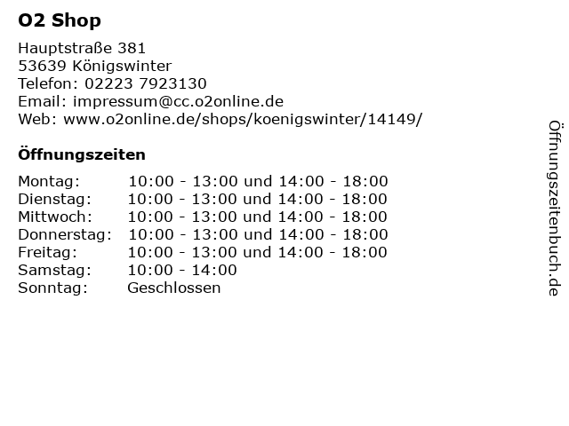 | Öffnungszeiten O2 Shop in Königswinter anzeigen | |