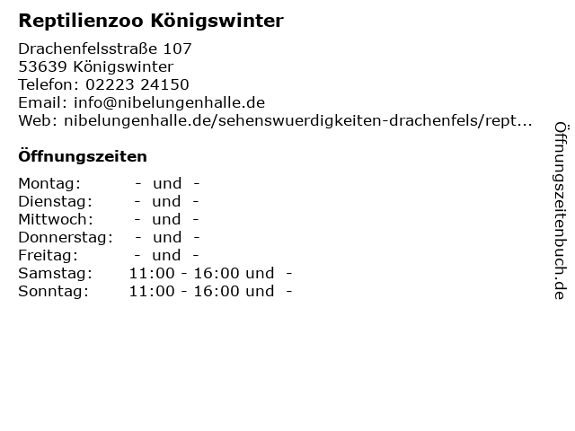 1 Reptilienzoo Königswinter (2. Nov.-14. März) (Entfernung: 0,00 km) Drachenfelsstraße 107, 53639 Königswinter 6 |