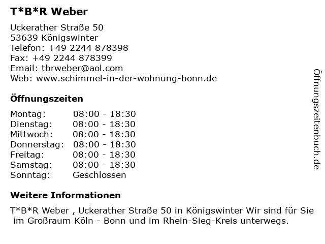 | Öffnungszeiten T*B*R Weber in Königswinter anzeigen | |