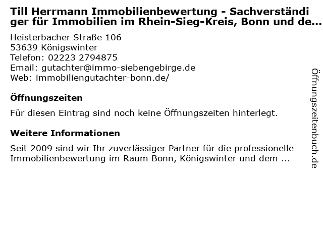 | Till Herrmann Immobilienbewertung - Sachverständiger für Immobilien im Rhein-Sieg-Kreis, Bonn und dem Westerwald anrufen | |