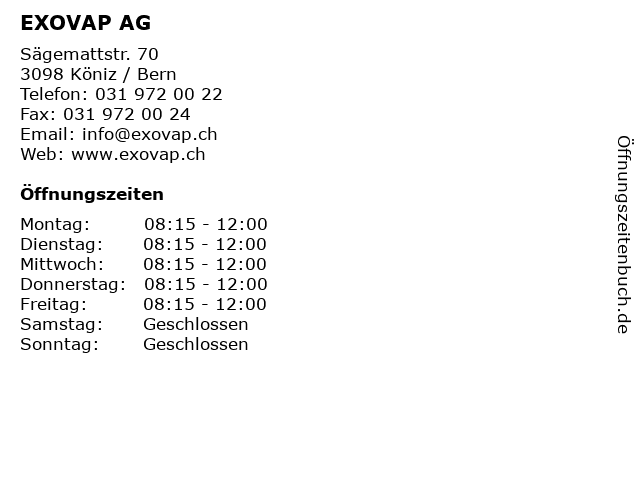 | Öffnungszeiten EXOVAP AG in Köniz / Bern anzeigen | |