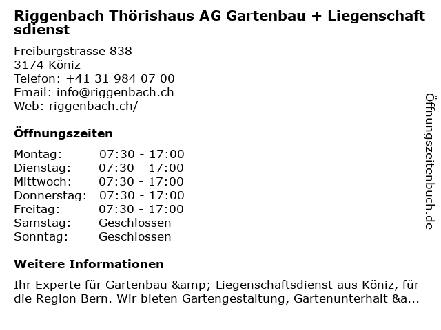 2 Riggenbach GmbH, Garten und Landschaft (Entfernung: 1,20 km) Wangentalstrasse 209, 3173 Oberwangen b. Bern 3 Riggenbach GmbH Garten und Landschaft (Entfernung: 1,20 km) Wangentalstrasse 209, 3173 Oberwangen b. Bern 6 |