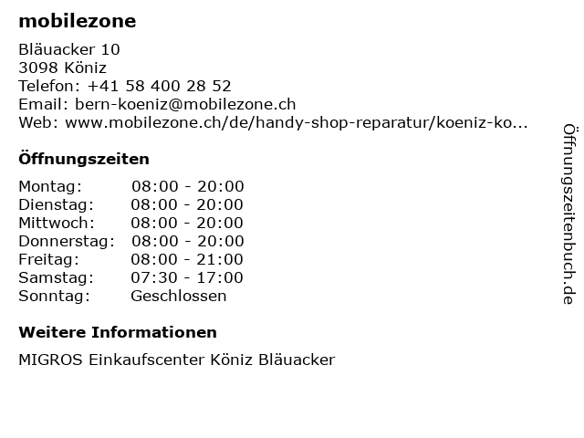 | Öffnungszeiten mobilezone in Köniz anzeigen | |