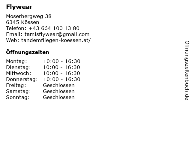 | Öffnungszeiten Flywear in Kössen anzeigen | |
