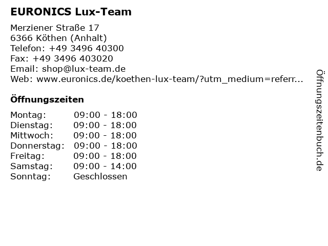 | Öffnungszeiten EURONICS Lux-Team in Köthen (Anhalt) anzeigen | |