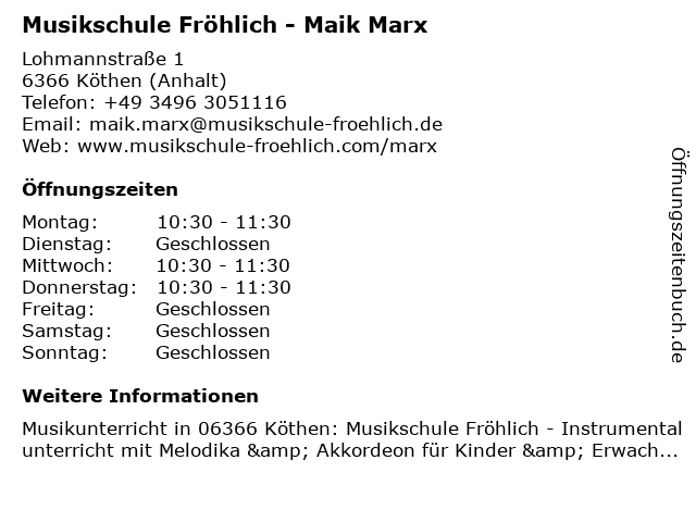 1 Musikschule Johann Sebastian Bach Köthen - Sekretariat (Entfernung: 1,15 km) Schlossplatz 4, 06366 Köthen 2 Deutsche Vermögensberatung (Dvag), Maik Nulsch (Entfernung: 3,36 km) Angergasse 5, 06369 Grossbadegast 5 Musikschule Fröhlich Inh. Erhard Schuster (Entfernung: 13,96 km) Karl-Heyer-Str. 5, 06193 Wettin-Löbejün 6 |
