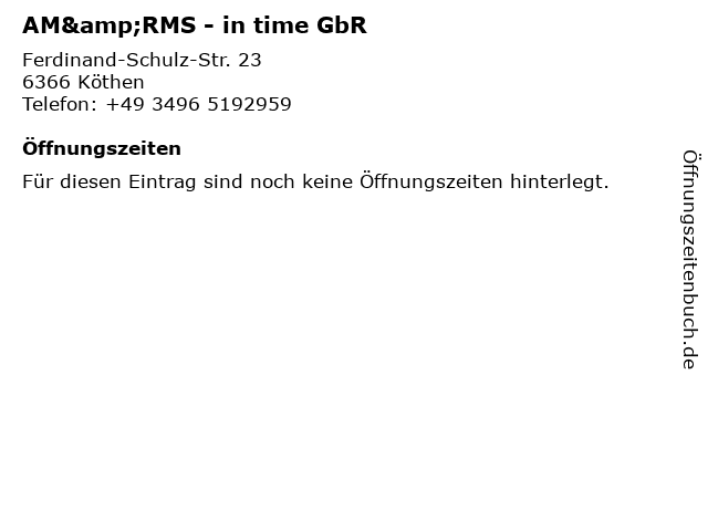 | Öffnungszeiten AM&RMS - in time GbR in Köthen anzeigen | |