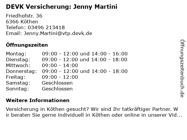 1 DEVK Versicherungen: Sven Majuntke (Berater*in ausgeschieden) (Entfernung: 0,00 km) Friedhofstr. 36, 06366 Köthen 4 Kleintransporte & Kurierdienst Jenny Baethe (Entfernung: 0,91 km) Rudolf-Breitscheid-Str. 28, 06366 Köthen 5 Frisierstübchen Inh. Jenny Klotsch (Entfernung: 6,79 km) Maxdorfer Hauptstr. 25a, 06386 Osternienburger Land 6 |