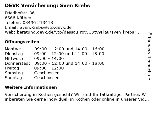 | Öffnungszeiten DEVK Versicherung: Sven Krebs in Köthen anzeigen | |