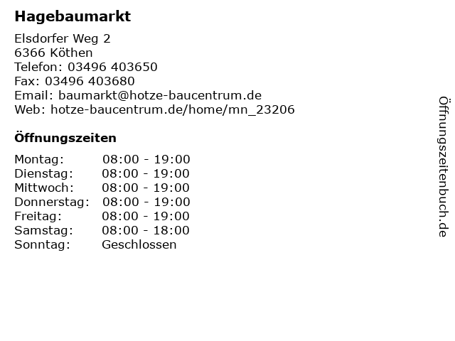 | Öffnungszeiten Hagebaumarkt in Köthen anzeigen | |