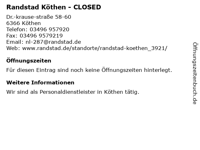 | Öffnungszeiten Randstad Köthen - CLOSED in Köthen anzeigen | |