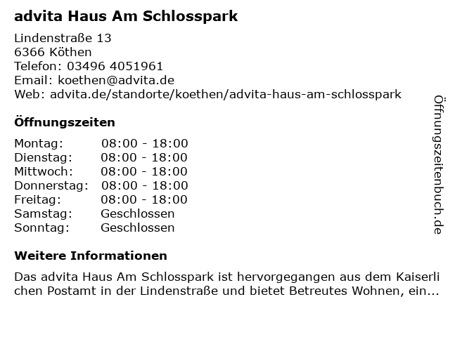 Öffnungszeiten advita Haus Am Schlosspark in Köthen anzeigen | |