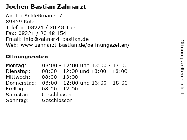 | Öffnungszeiten Jochen Bastian Zahnarzt in Kötz anzeigen | |
