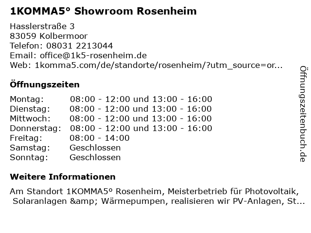 Branchen & Suchbegriffe zu 1KOMMA5° Showroom Rosenheim:1komma5°, anbieter für heizungsbedarf, anbieter für industrieanlagen, elektrizitätswerk, hlk-montage, showroom, unternehmen für solarenergie |