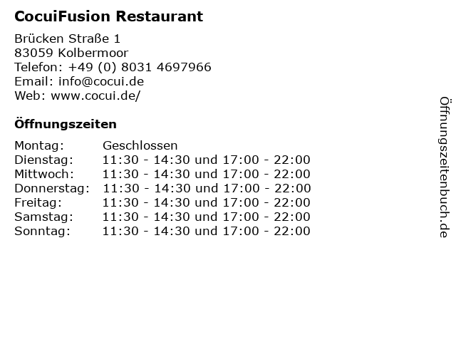 | Öffnungszeiten CocuiFusion Restaurant in Kolbermoor anzeigen | |