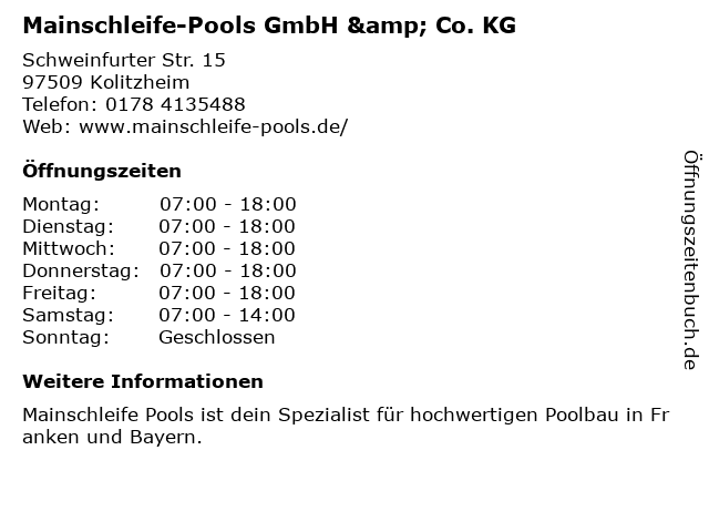 Branchen & Suchbegriffe zu Mainschleife-Pools GmbH & Co. KG:geschäft für swimmingpoolzubehör, mainschleife, pools, reparaturservice für swimmingpools, swimmingpoolpflege, öffentliches schwimmbad |