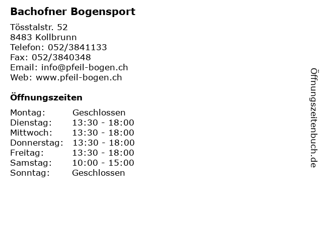 | Öffnungszeiten Bachofner Bogensport in Kollbrunn anzeigen | |
