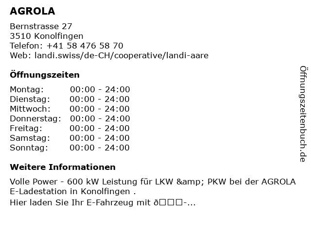 | Öffnungszeiten AGROLA in Konolfingen anzeigen | |