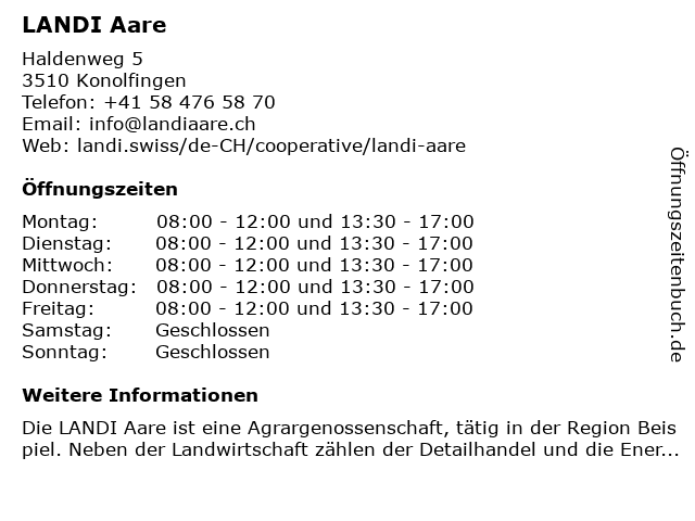 | Öffnungszeiten LANDI Aare in Konolfingen anzeigen | |