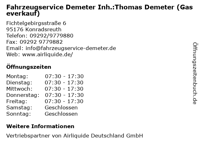 Branchen & Suchbegriffe zu Fahrzeugservice Demeter Inh.:Thomas Demeter (Gaseverkauf):air, anlieferung, demeter, fahrzeugservice, gase, gaseverkauf, lebensmittel-gase, liquide, metall, propan, technische-gase, thomas, transport, u. |