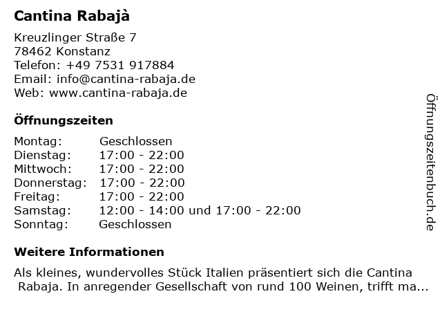 | Öffnungszeiten Cantina Rabajà in Konstanz anzeigen | |