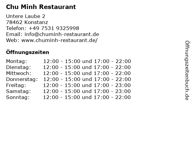 | Öffnungszeiten Chu Minh Restaurant in Konstanz anzeigen | |