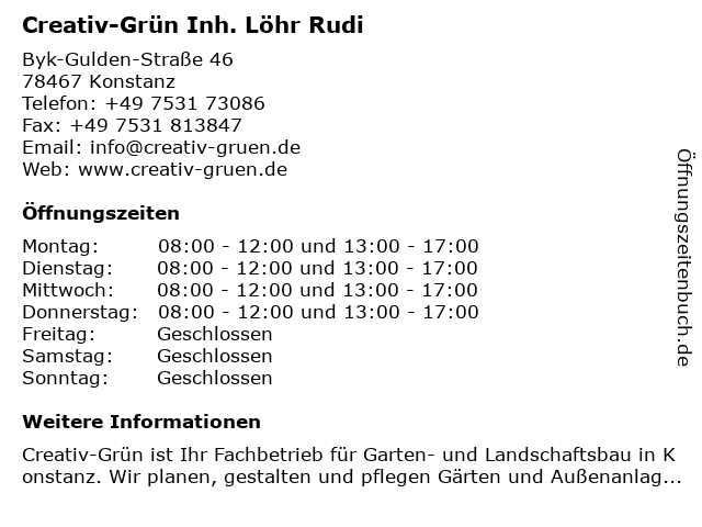 | Öffnungszeiten Creativ-Grün Inh. Löhr Rudi in Konstanz anzeigen | |