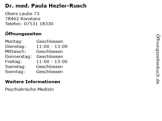 | Öffnungszeiten Dr. med. Paula Hezler-Rusch in Konstanz anzeigen | |