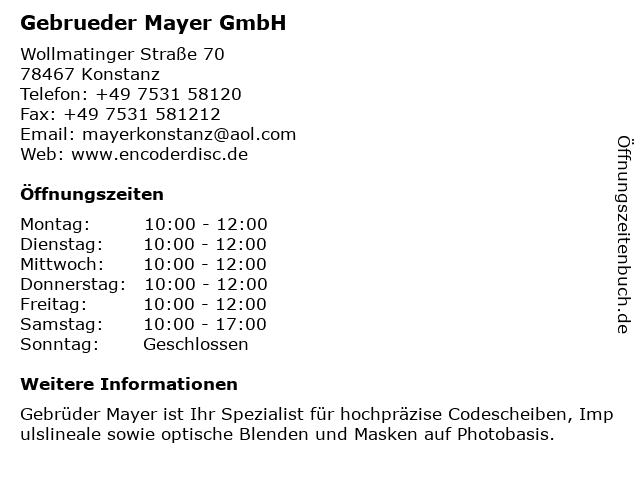 | Öffnungszeiten Gebrueder Mayer GmbH in Konstanz anzeigen | |