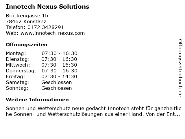 | Öffnungszeiten Innotech Nexus Solutions in Konstanz anzeigen | |