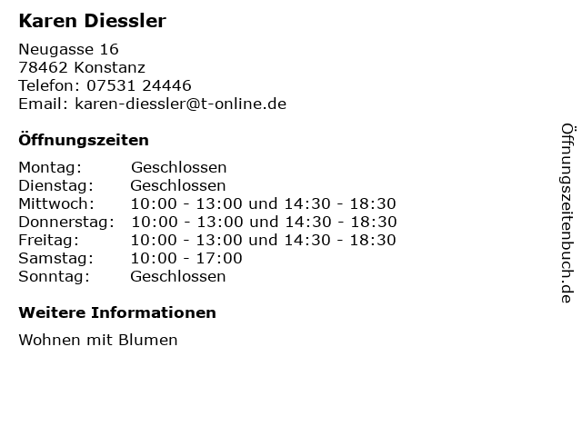 | Öffnungszeiten Karen Diessler in Konstanz anzeigen | |